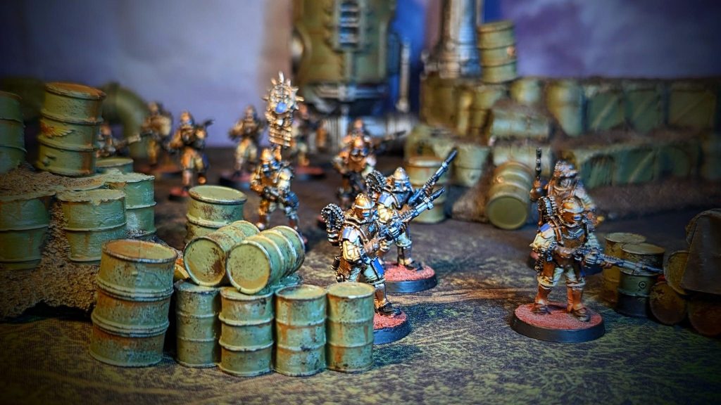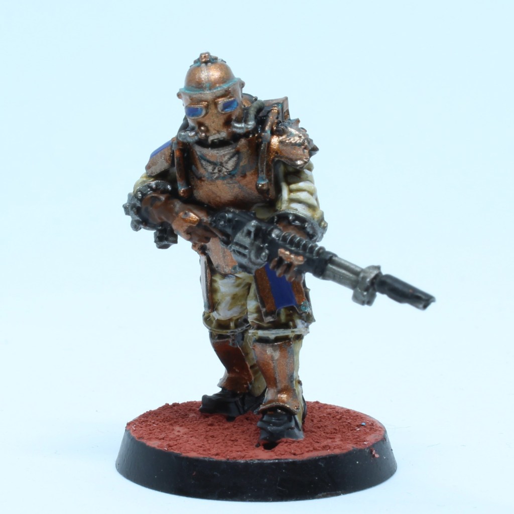 During the opening stages of the Horus Heresy the 1212th, along with the entire 216th Expeditionary Fleet, were in the midst of a compliance campaign. Caught unawares by a traitor Night Lords fleet, they suffered horrendous casualties, with barely half the cohort surviving. By chance, the accompanying Mechanicum ships had a number of thallax carapaces, and in desperation for fighting forces, Horatio agreed to the mass conversion of those auxiliaries too wounded to fight on. As such the 1212th feature a large contingent of Mechanicum troops, who are held in admiration for their sacrifice, but also as a grim reminder of the fate that could await any auxiliary.