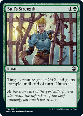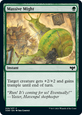 The game plan is pretty simple, it’s all about tooling Galea up and relying on commander damage to win the game. To do that I need ways to get round blockers – either with trample or unlockable damage. Whilst I do have some equipment that does this, like the Behemoth Sledge and Hedgewitch’s Mask, I find instants are more helpful. This is because my opponent knows what equipment I have on Galea, but doesn’t know what instants I have in hand. So I can swing out with Galea, let me opponent chump block with a 1/1 and then play something like Massive Might or Bull’s Strength.