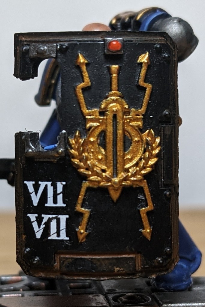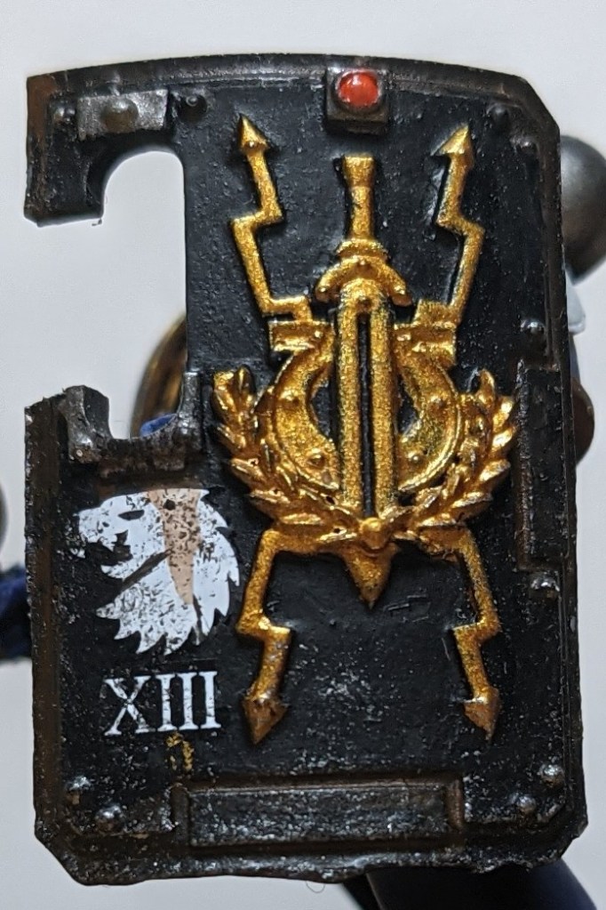 Having served in the breacher companies of the 20th Chapter, Cato was well versed in fleet actions and always fought with an artificer, eagle-wrought breacher shield that he was gifted on his ascension to captain. In light of his achievement and operating as a Suzerain bodyguard for Guilliman on Greenor, he took a variation of the Invictarus Eagle as his personal heraldry. This personal heraldry would go on to become the chapter symbol for the newly founded Black Consul chapter.