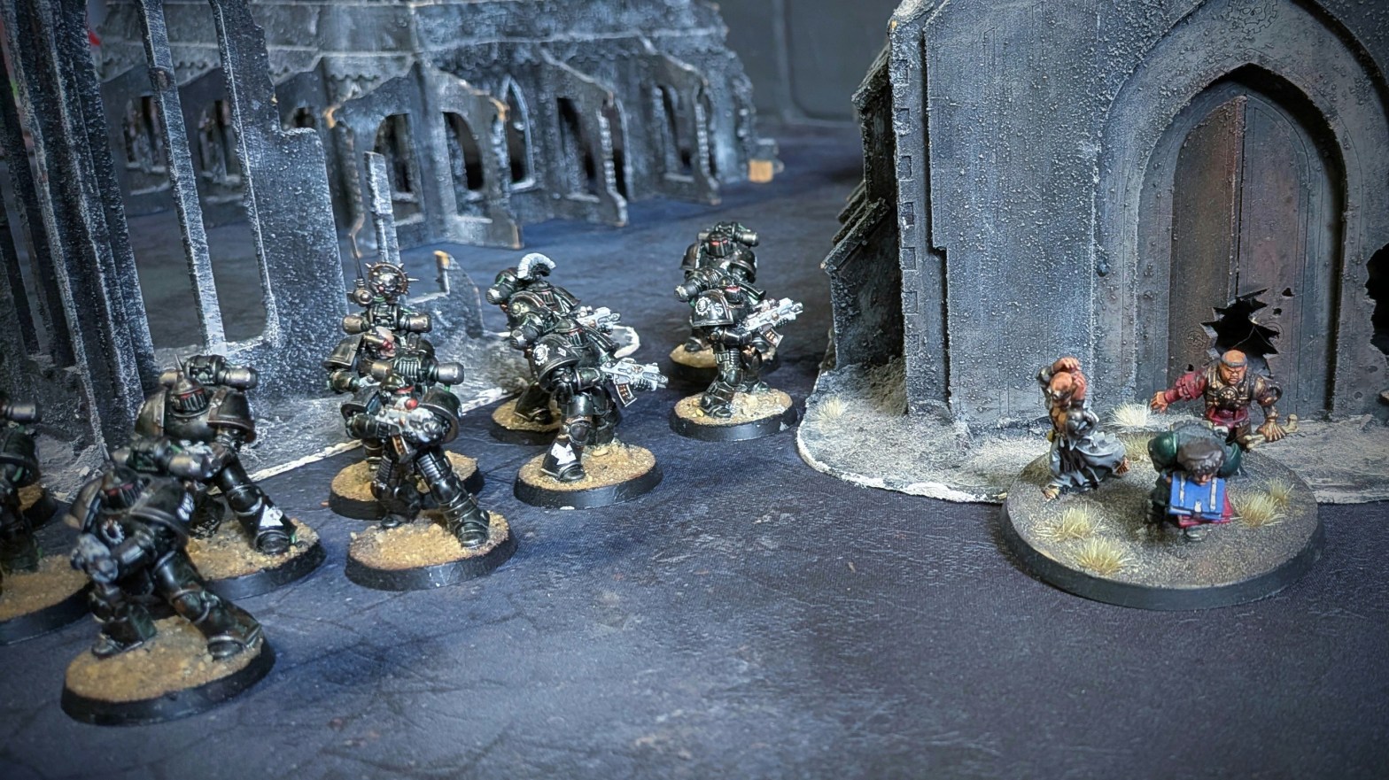 A unit calling themselves The Noosemen first identified themselves on Jemerq’ua. They arrived in a light cruiser that orbital stacks flagged as the Dragon Claw, recorded as lost on Isstvan V. However most traces of this ship’s former life in the Salamanders legion had been scoured clean. Each marine’s armour was painted black and they had no discernible markings.