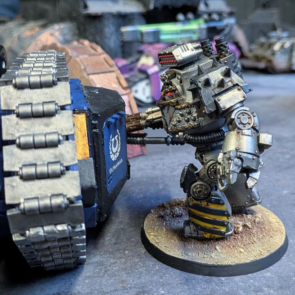 - He is likely a member of an augur command and control squad based on his modified Mark III armour with a non-standard backpack. Fitted with additional battery capabilities, this allows a better integration with the logistic nexus and tacticae screens required to operate chapter-level warfare. Being so power hungry, such devices are usually reserved for command level vehicles such as the Damocles Rhino or Leviathan command vehicle. As Iron Warriors preferred to use a “portable” version which necessitated extra power provided by the user.