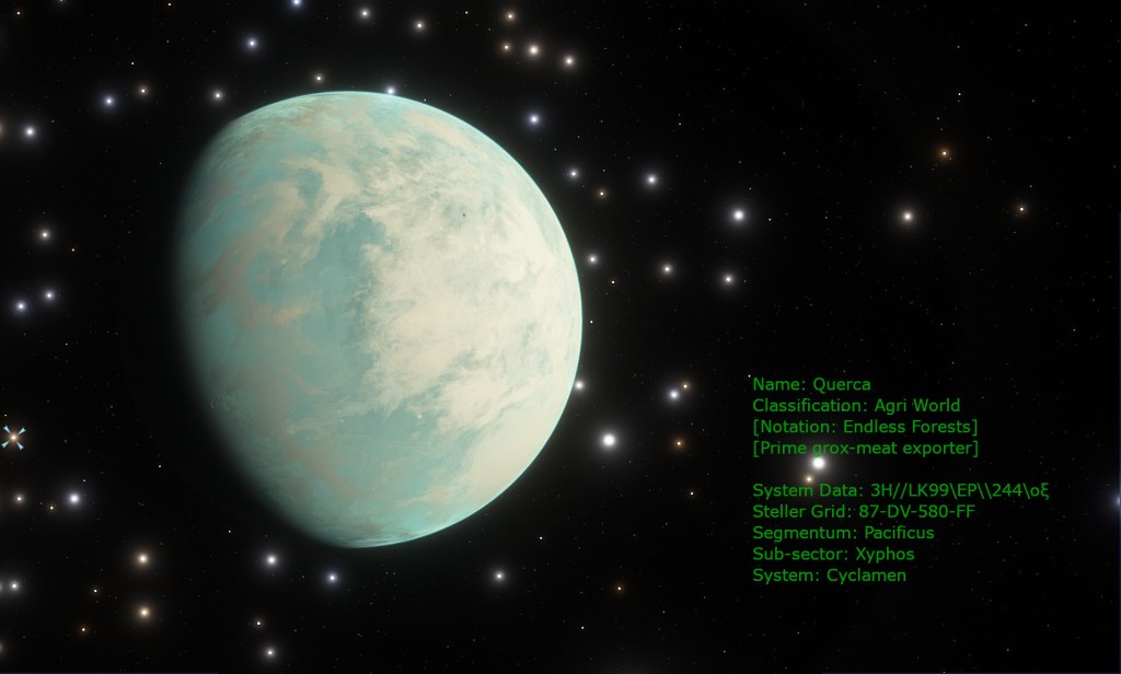 Cyclamen is the bread basket of the sub-sector and features a number of agri-worlds each specialising in a different foodstuff. Querca, the largest of the habited planets is also the unofficial system capital. Predominantly covered in immense forests, human settlement is condensed into a number of clearings and a mountain range around the planet’s equator. A popular resort of the sub-sector’s elite, this planet contains vast breweries making everything from cheap Amasec to the finest Whisky.
